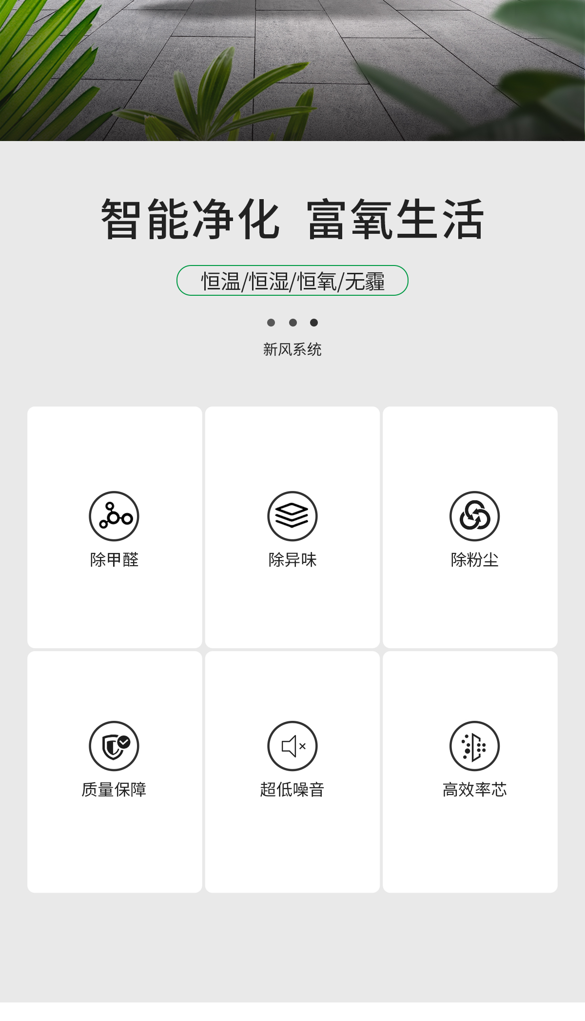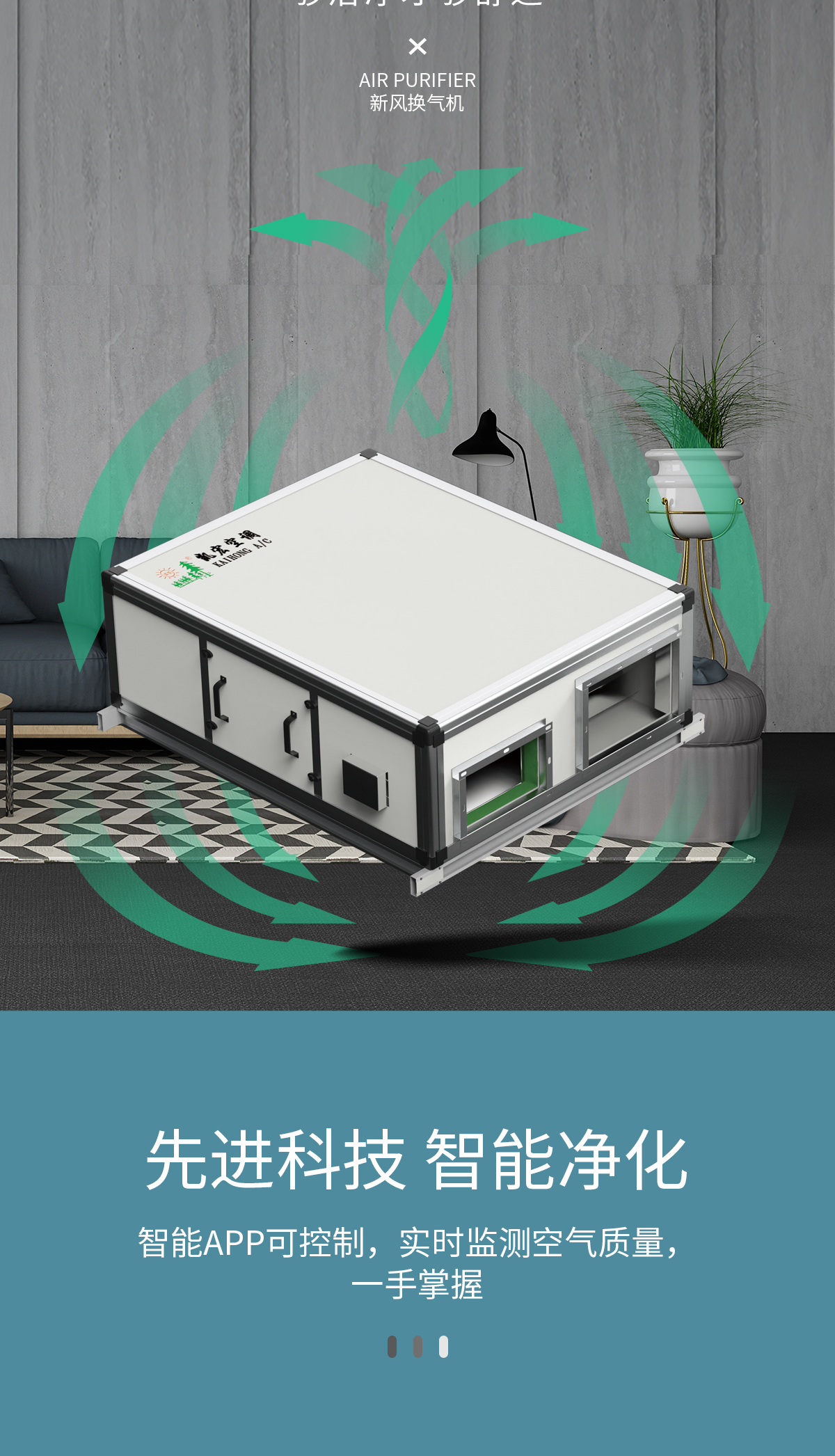 雙向換氣 室內外氣體等量置換。獨特的熱交換器設計,把室內污濁空氣與室外新鮮空完全分開,防止室內外空氣交叉污染 靜音設計,安全可靠 內置低噪音外轉子離心風機,機組璧覆有新型吸聲材料,運行平穩噪音低,防止了對現場的干擾。整機除風機外無運動部件,幾乎無需維護,可確保長期穩定可靠工作 過濾凈化功能 進入室內的空氣在機組中經專業級過濾器過濾,有效防止灰塵和有害物質進入室內,保持室內空氣新鮮,同時可選用靜電凈化器、負離子發生器、光觸媒等凈化設備